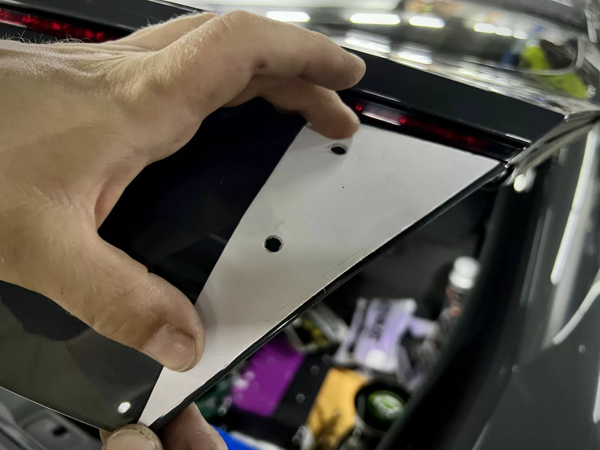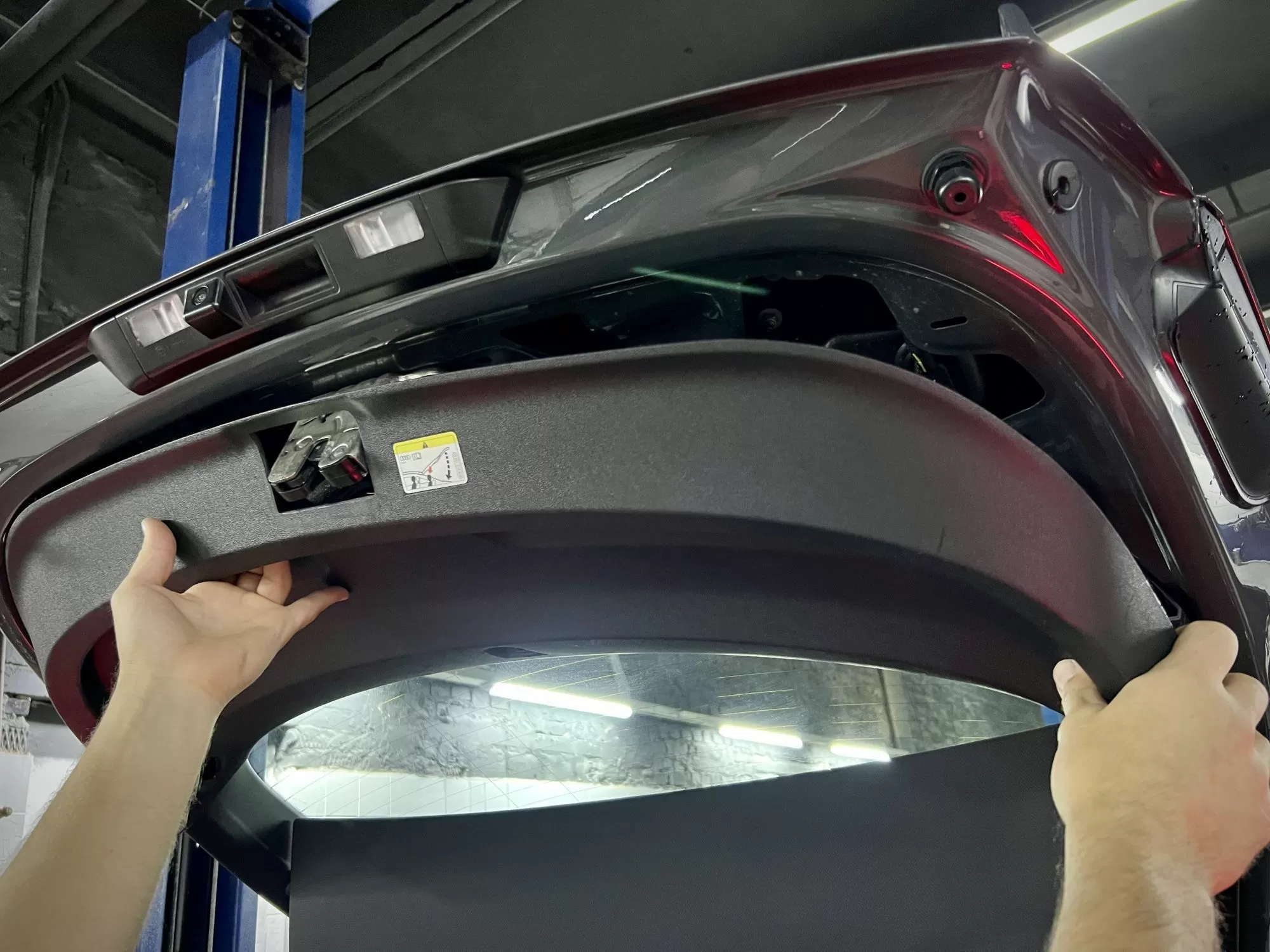 To install the spoiler, you must remove the trunk panel. To do this, first remove the lock panel, then take out 2 clips and then remove the trunk panel (it is held on by clips).