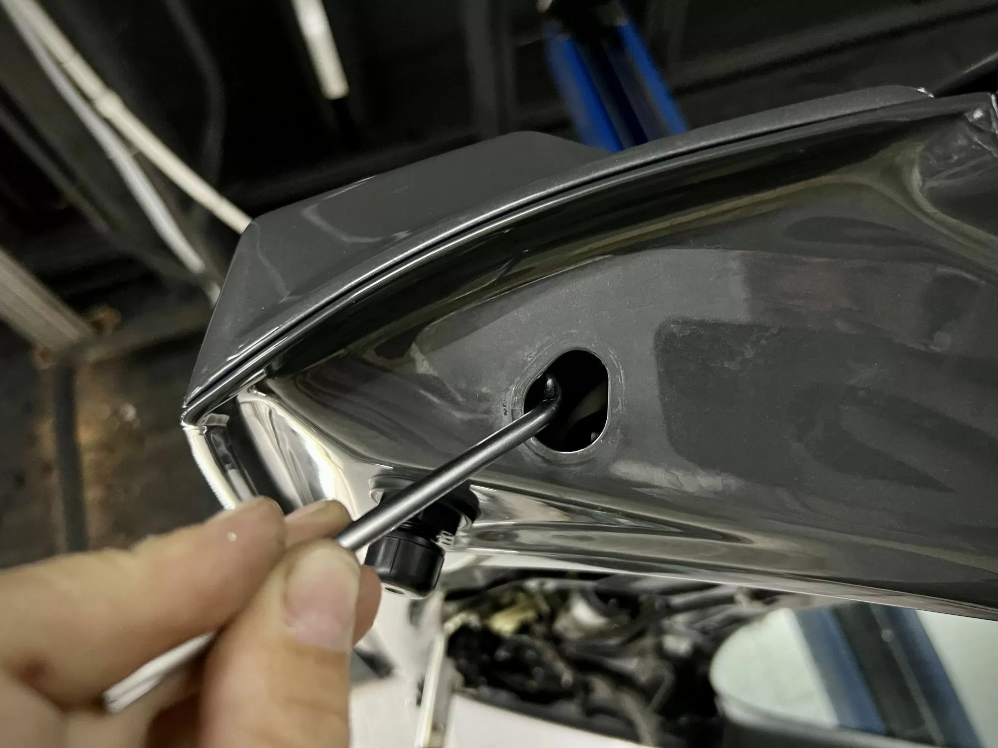 Having previously glued double-sided tape to the parts, install them. To make tightening the bolts easier, we recommend removing the rubber band and tightening it through the hole.